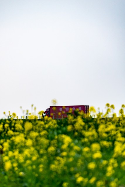 开往春天的汽车.春天里上海嘉定安亭绕城高速旁的麦田与油菜花