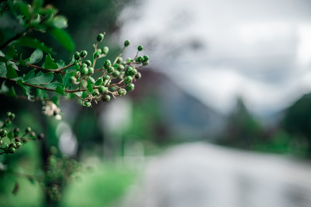 中国山东省泰安市,绿色的灌木植物和结出的绿色的圆形果实。