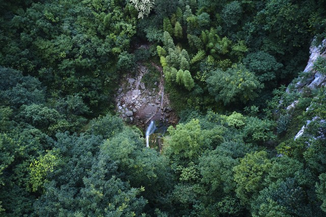 夏季绿色阳光鸟瞰热带野生森林和瀑布