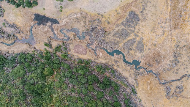 大凉山秘境——谷克德发现的神秘景观,枯黄高原草甸内,一条河流蜿蜒而过,从高空看去,神似一条巨龙在吐水
