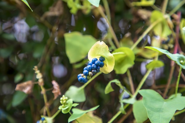 2022年9月22日,吉林省吉林市松花江畔自然生长的杠板归结出了蓝莓似的果实。