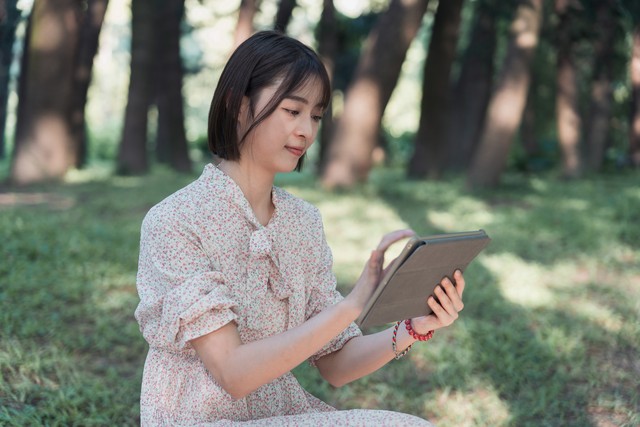 秋日午后,年轻的中国女性在森林公园散步 、听音乐、使用手机等一系列形象肖像