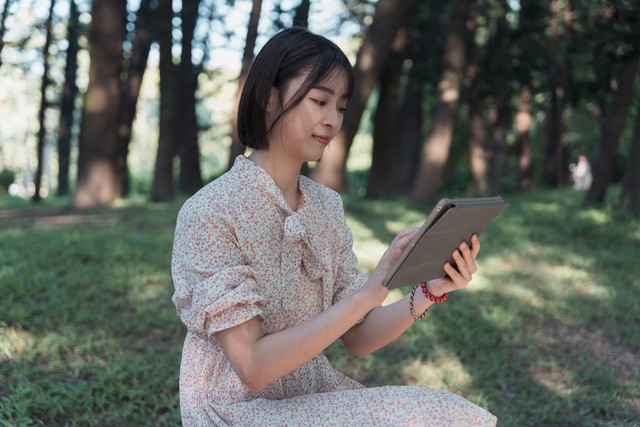 秋日午后,年轻的中国女性在森林公园散步 、听音乐、使用手机等一系列形象肖像