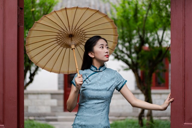 身穿旗袍在庭院散步的年轻女孩