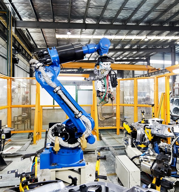 蓝色的自动化机械臂在生产流水线是工作