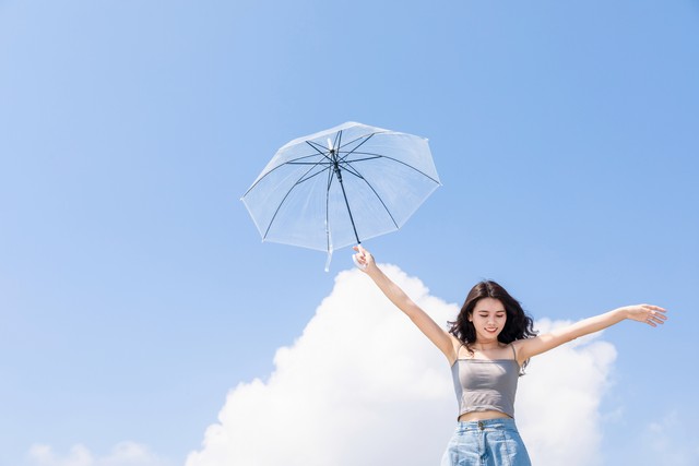 蓝天白云下撑伞的中国年轻女性