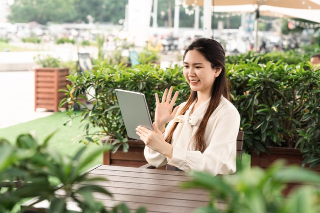 亚洲女士使用平板电脑进行交流