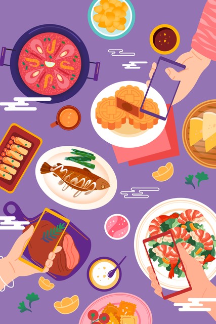 卡通中秋佳节亲子家人情侣团圆传统节日习俗月饼餐饮餐厅拍照吃饭朋友聚会美食电商顶视图中国风国潮矢量插画