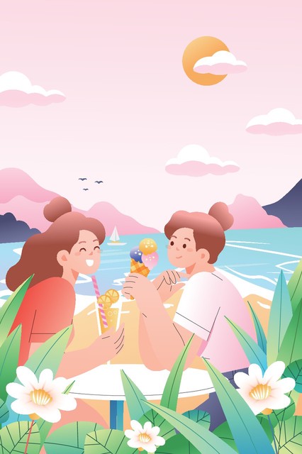 卡通夏季夏天情侣闺蜜朋友吃饭美食餐饮饮料下午茶甜点蛋糕郊游旅行出游烹饪做饭电商促销渐变矢量插画