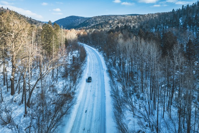 冬季吉林长白山森林公路S302自驾游旅行航拍自然风光