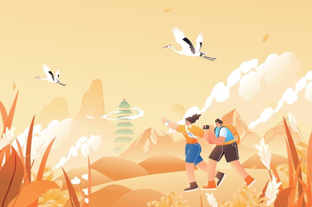 卡通亲子游家人学生情侣老人养老重阳节登高风景自然旅游旅行踏秋季节秋分团圆家庭郊游户外露营渐变矢量插画