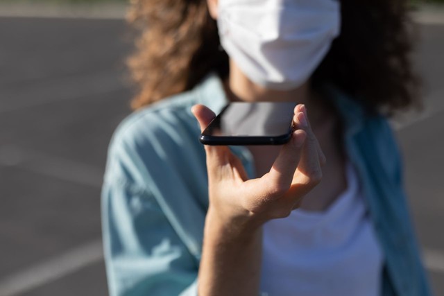 白人妇女在街上戴着防护面具,用手机