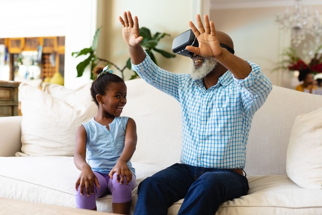 非裔美国女孩微笑着,她的祖父戴着VR耳机坐在沙发上打手势