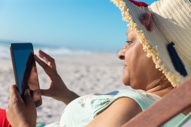 退休的资深非裔美国妇女坐在海滩的椅子上使用数字平板电脑