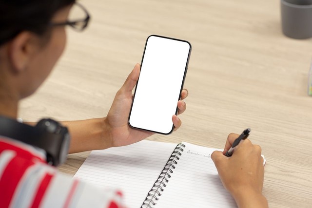 在空白屏幕上使用带有复制空间的智能手机的混血女商人的肩部视图