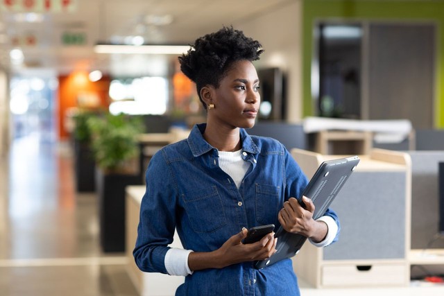 年轻的非裔美国女商人拿着智能手机和笔记本电脑,看着工作场所