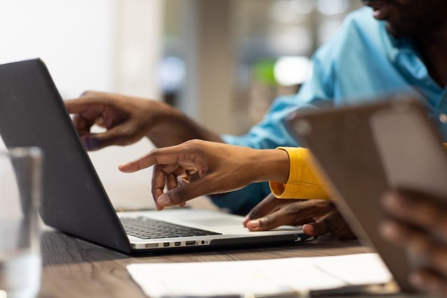 会议期间一起讨论时,多种族同事用手指着笔记本电脑