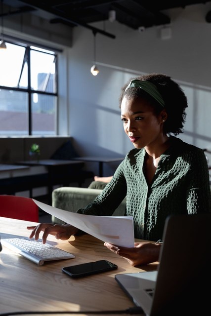 非洲裔美国年轻女商人在办公室使用电脑处理文件