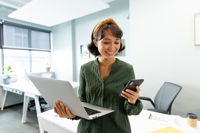 亚洲女建筑师在创意办公室使用智能手机与笔记本电脑