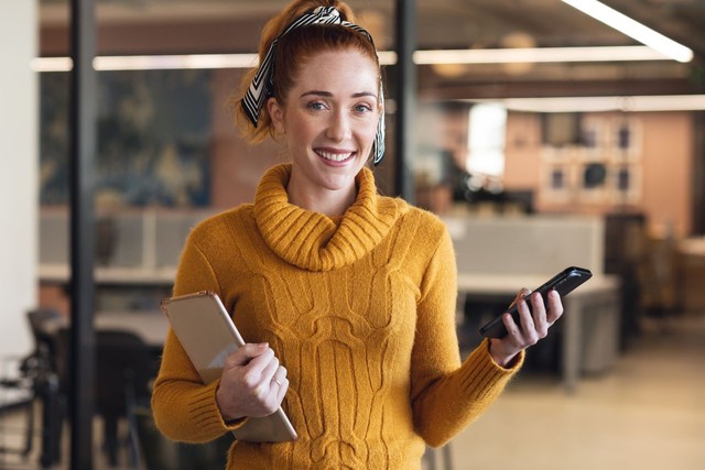微笑的中年白人女商人肖像,办公室里有智能手机和数字平板电脑
