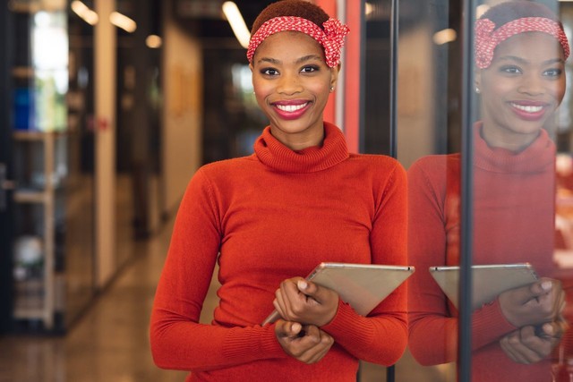 办公室玻璃墙旁微笑的非裔美国女商人与数字平板电脑的肖像
