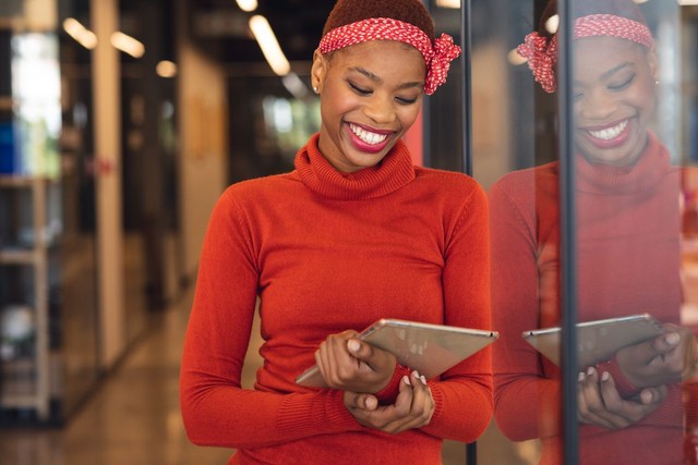 微笑的非裔美国女商人在办公室的玻璃墙上看着数字平板电脑