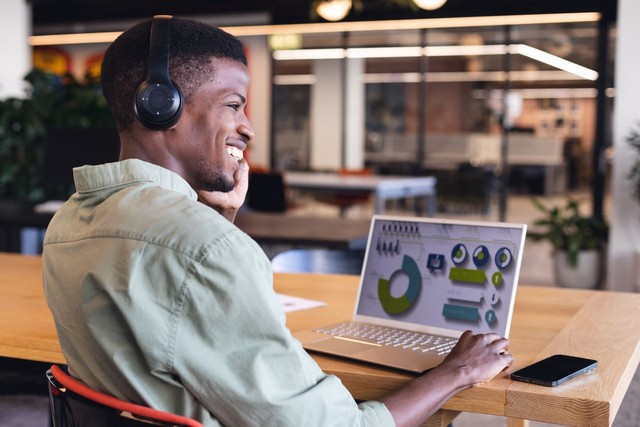 微笑的非裔美国年轻商人一边打电话一边在笔记本电脑上计划策略