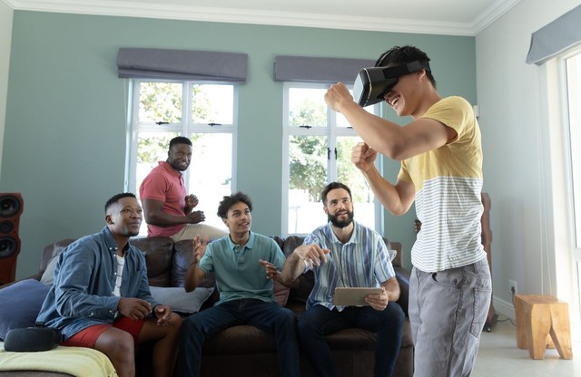多种族朋友坐在沙发上看着穿着虚拟现实模拟器拳击的男人