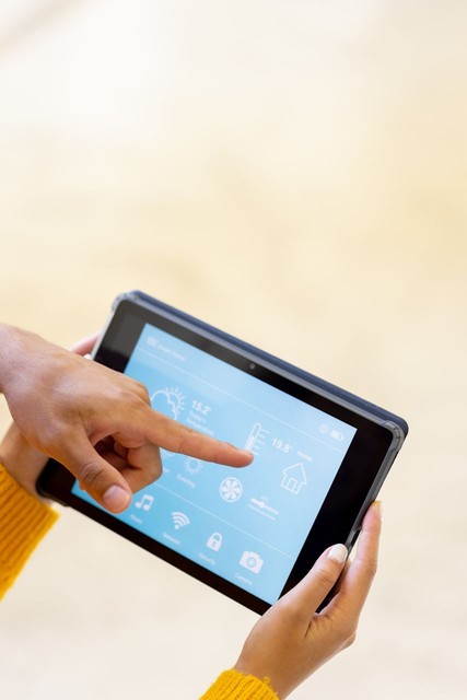 出生的年轻人指着数字平板电脑上的应用程序和控制智能家居的女人