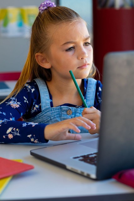专注的高加索女学生在小学课堂上使用笔记本电脑