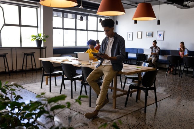 混血男性创意坐在办公桌上,在休闲办公室使用平板电脑