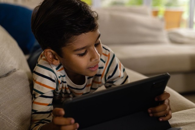 快乐的混血儿男孩躺在沙发上,在客厅里使用平板电脑