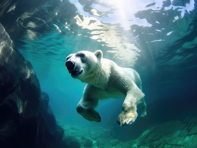 一只白色的北极熊在大海水下游泳。大自然中的野生动物