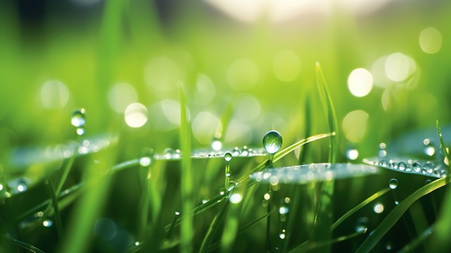 绿叶和水滴特写,自然绿色概念。露珠在绿叶上,美丽模糊的散景背景。绿色自然概念。地球日,拯救纯水概念。
