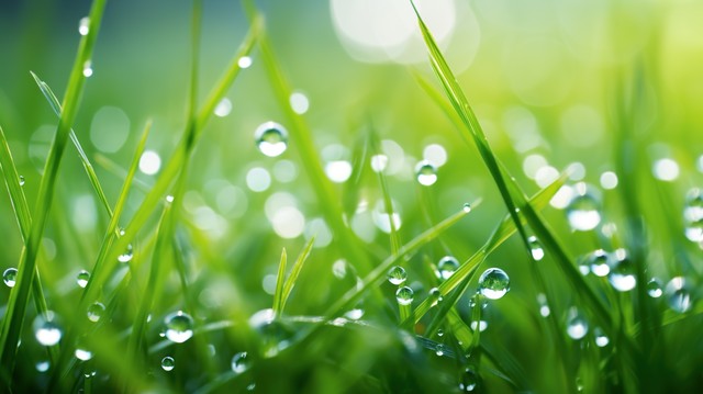 绿叶和水滴特写,自然绿色概念。露珠在绿叶上,美丽模糊的散景背景。绿色自然概念。地球日,拯救纯水概念。