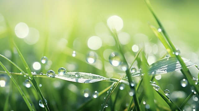 绿叶和水滴特写,自然绿色概念。露珠在绿叶上,美丽模糊的散景背景。绿色自然概念。地球日,拯救纯水概念。