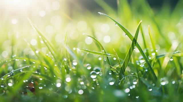 绿叶和水滴特写,自然绿色概念。露珠在绿叶上,美丽模糊的散景背景。绿色自然概念。地球日,拯救纯水概念。