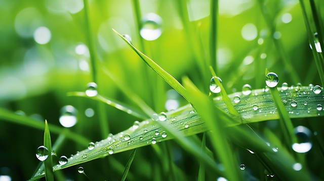 绿叶和水滴特写,自然绿色概念。露珠在绿叶上,美丽模糊的散景背景。绿色自然概念。地球日,拯救纯水概念。
