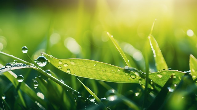 绿叶和水滴特写,自然绿色概念。露珠在绿叶上,美丽模糊的散景背景。绿色自然概念。地球日,拯救纯水概念。