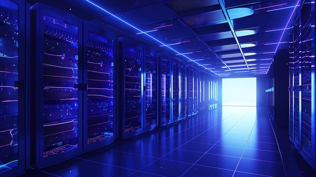 服务器机房或服务器计算机。3d渲染。数据中心背景。计算机数据仓库的云存储技术。云数据库光下的数字信息
