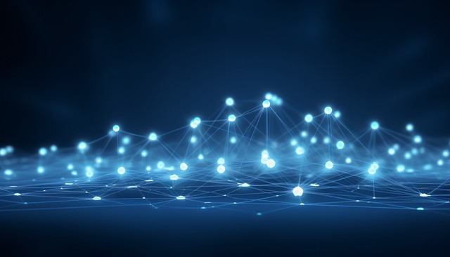 电路板.电子计算机硬件技术.主板数字芯片 3D网络连接背景发光的灯光和连接线和圆点