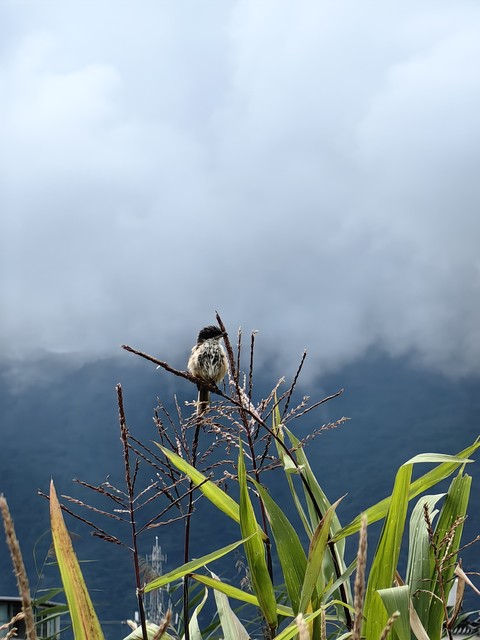 自然中的小鸟,停在麦田的鸟,在多云的天空下栖息在植物上的鸟的特写镜头
