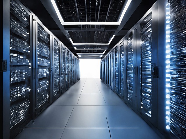 数据中心抽象背景.服务器机房内部.数字信息仓库. Web托管技术.数据库通信系统中的计算机机架