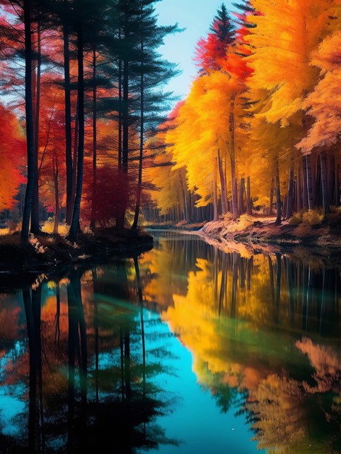 金秋胡杨林黄金色的树林秋天大自然风景,金色树叶翡翠湖泊倒影的优美森林景观背景
