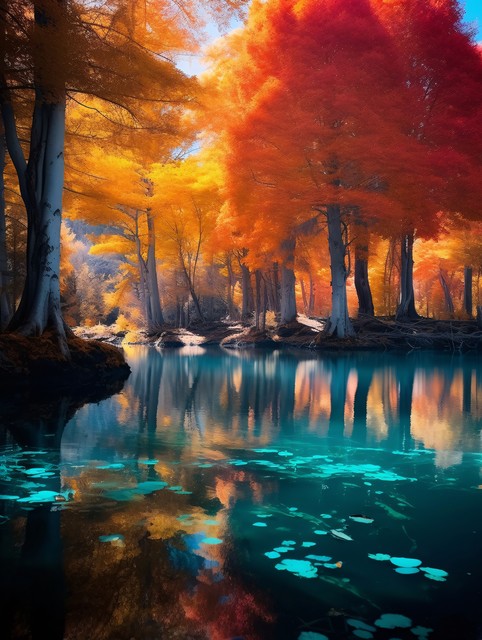 金秋胡杨林黄金色的树林秋天大自然风景,金色树叶翡翠湖泊倒影的优美森林景观背景