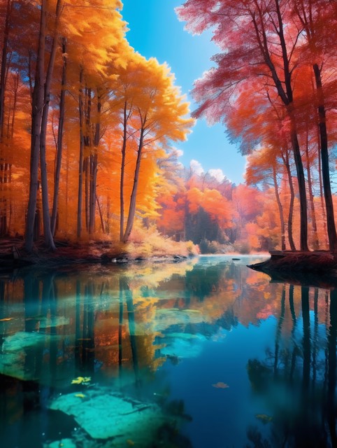 金秋胡杨林黄金色的树林秋天大自然风景,金色树叶翡翠湖泊倒影的优美森林景观背景