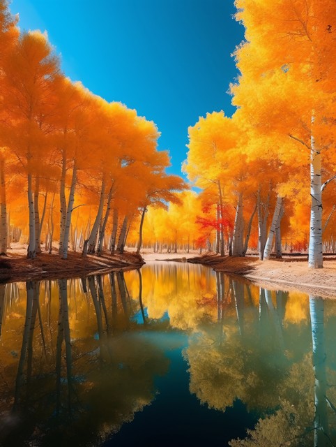 金秋胡杨林黄金色的树林秋天大自然风景,金色树叶翡翠湖泊倒影的优美森林景观背景