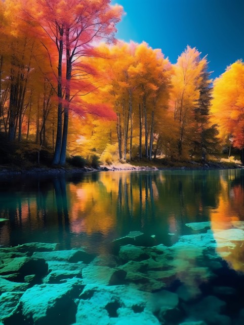 金秋胡杨林黄金色的树林秋天大自然风景,金色树叶翡翠湖泊倒影的优美森林景观背景