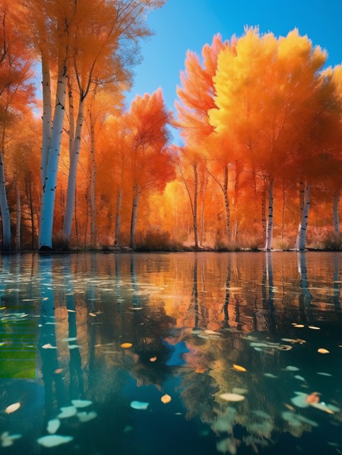 金秋胡杨林黄金色的树林秋天大自然风景,金色树叶翡翠湖泊倒影的优美森林景观背景