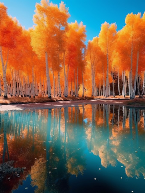 金秋胡杨林黄金色的树林秋天大自然风景,金色树叶翡翠湖泊倒影的优美森林景观背景